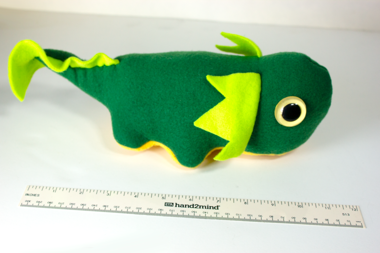 All hand-sewn soft fleece with plastic, hand-painted safety eyes, and poly-fil stuffing. Colors and exact size may vary a bit from Frightdorable to Frightdorable.